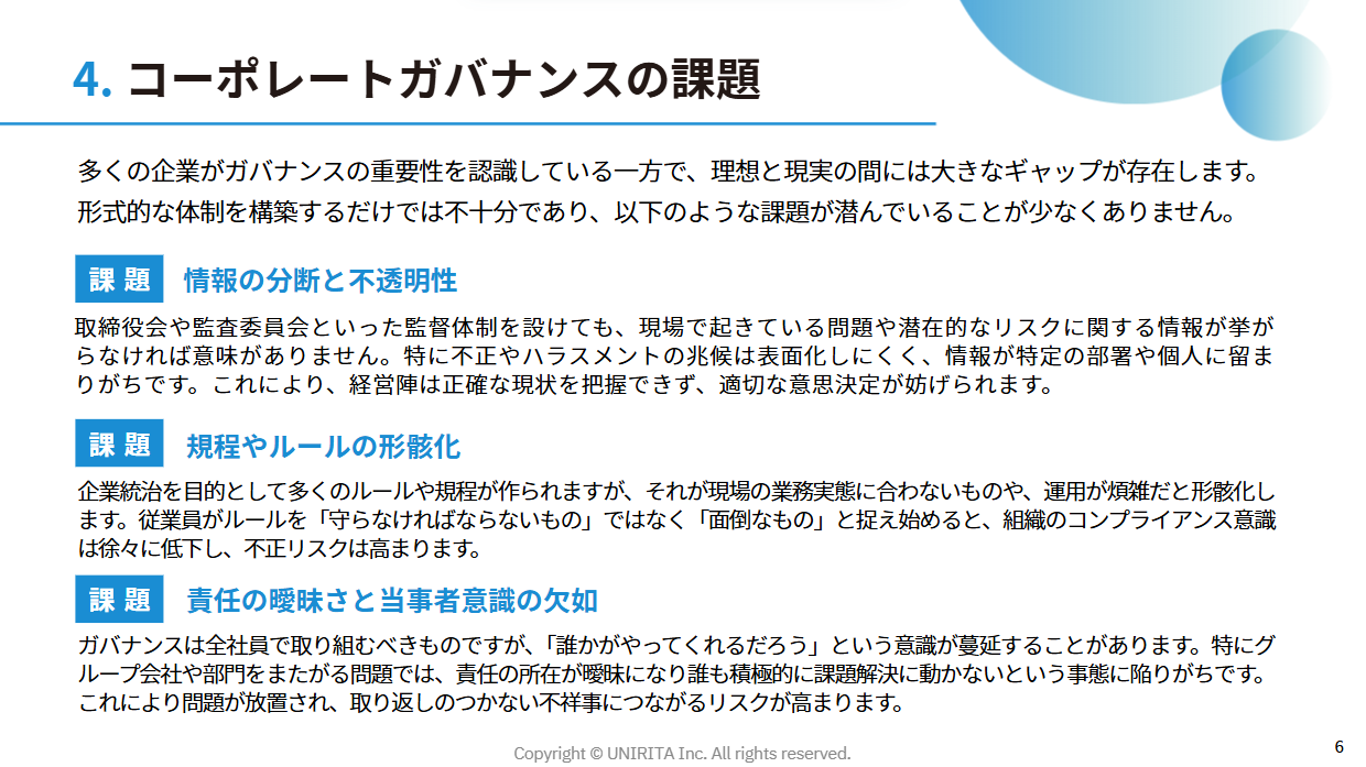 本ホワイトペーパーでは、コーポレートガバナンスの基本概念から、内部統制の機能不全を解消する具体的な手法、そしてグループ会社を含めた統制を強化するための仕組みづくりまでを網羅的にご紹介します。