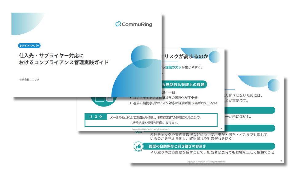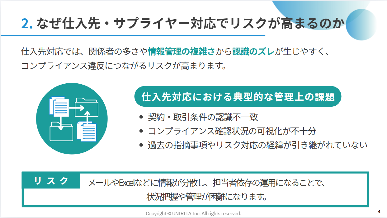 本資料では、なぜ仕入先・サプライヤー対応でコンプライアンスリスクが高まるのか、
